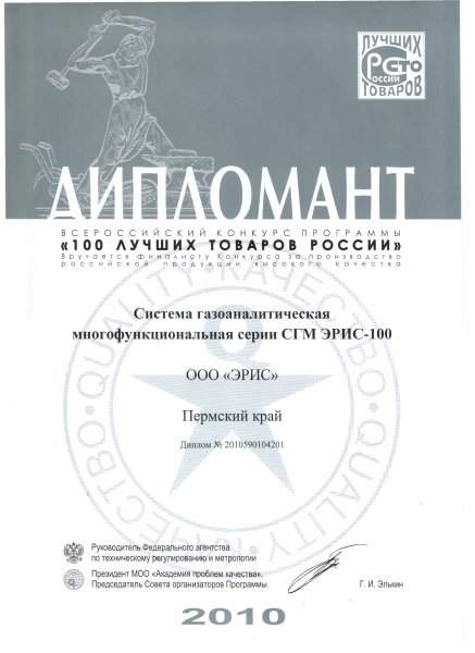 Группа компаний «Эрис» стала дипломантом конкурса «100 Лучших товаров России 2010» в номинации «Услуги промышленности» и «Продукция промышленного назначения».