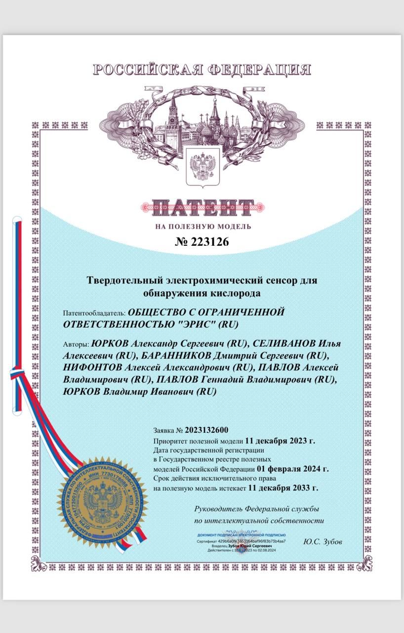 ERIS has received a new patent for a solid-electrolyte electrochemical sensor for detecting oxygen, intended for use in the company's new device.