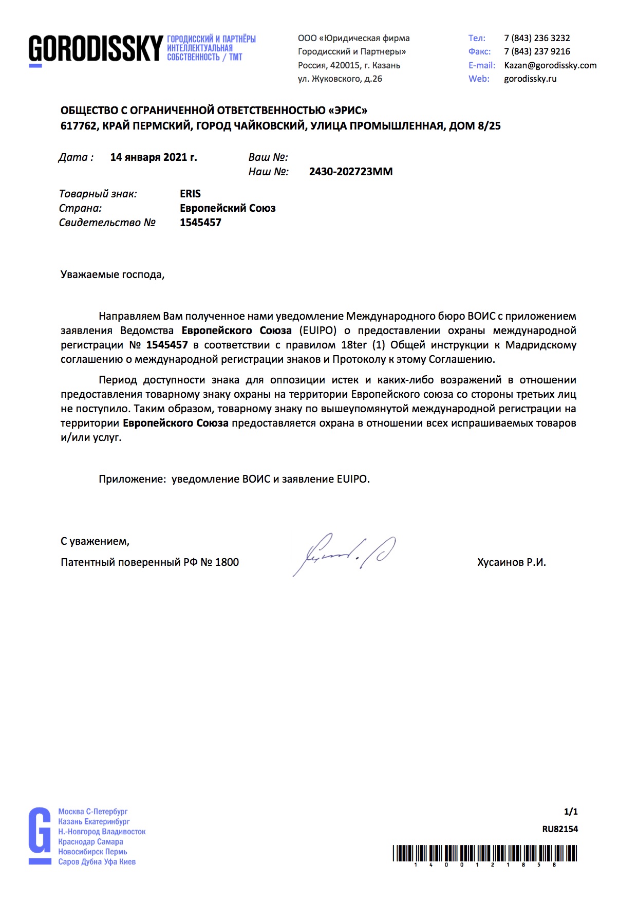 The ERIS International Mark is recognized in the European Union. Registration under the Madrid System will allow the Company to secure its foreign trade activity; more actively promote devices in all European Union countries, and establish new, promising business contacts.